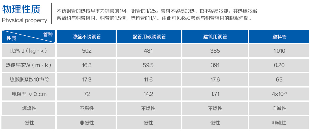 不銹鋼管的熱傳導率為鋼管的1/4、銅管的1/25。管材不容易加熱、也不容易冷卻,其熱漲冷縮系數(shù)約與銅管相同,銅管的1.5倍,塑料管的1/4。由此可見必須考慮與銅管相…