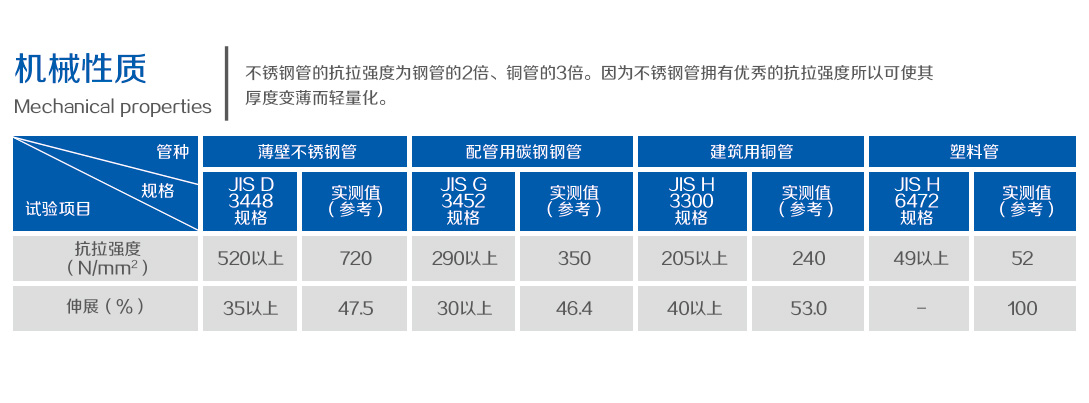 不銹鋼管的抗拉強(qiáng)度為鋼管的2倍、銅管的3倍。因?yàn)椴讳P鋼管擁有優(yōu)秀的抗拉強(qiáng)度所以可使其厚度變薄而輕量化。